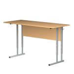 Стол ученический двухместный. Основа металлокаркас, изготовлен из мебельной трубы с цветным полимерным покрытием. Столешница и передняя панель выполнены из ламинированной ДСП 16 мм, торцы облицованы кантом ПВХ 2 мм. Имеются два крючка для портфелей. На свободных концах труб установлены заглушки из ударопрочных полимеров. Вся мебель изготавливается под заказ